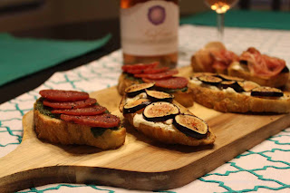 Anyway, this is a really nice crisp, dry wine. It isn't at all sweet, but it isn't too tart. It's nicely balanced. The skins added tannins, which give it a tiny bit of astringency. I realize that doesn't sound like something you would want to find in your wine, but it worked here and was not at all unpleasant. This wine was great with spicy foods, but also it cuts sweetness nicely. I served it with some easy happy hour foods, a few kinds of bruschetta and also some figs stuffed with goat cheese and wrapped in prosciutto.